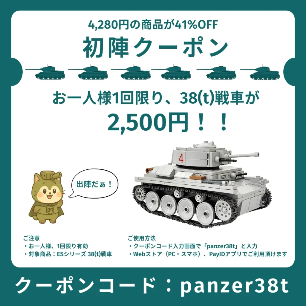 初陣 クーポンの使い方 ~ あなたの最初の一両はここから ~ 初陣クーポン の内容 パンツァーブロックスの世界への“初陣”を応援する特別クーポンです。ぜひこの機会にブロック戦車の世界に出陣しましょう。 対象商品 ESシ
